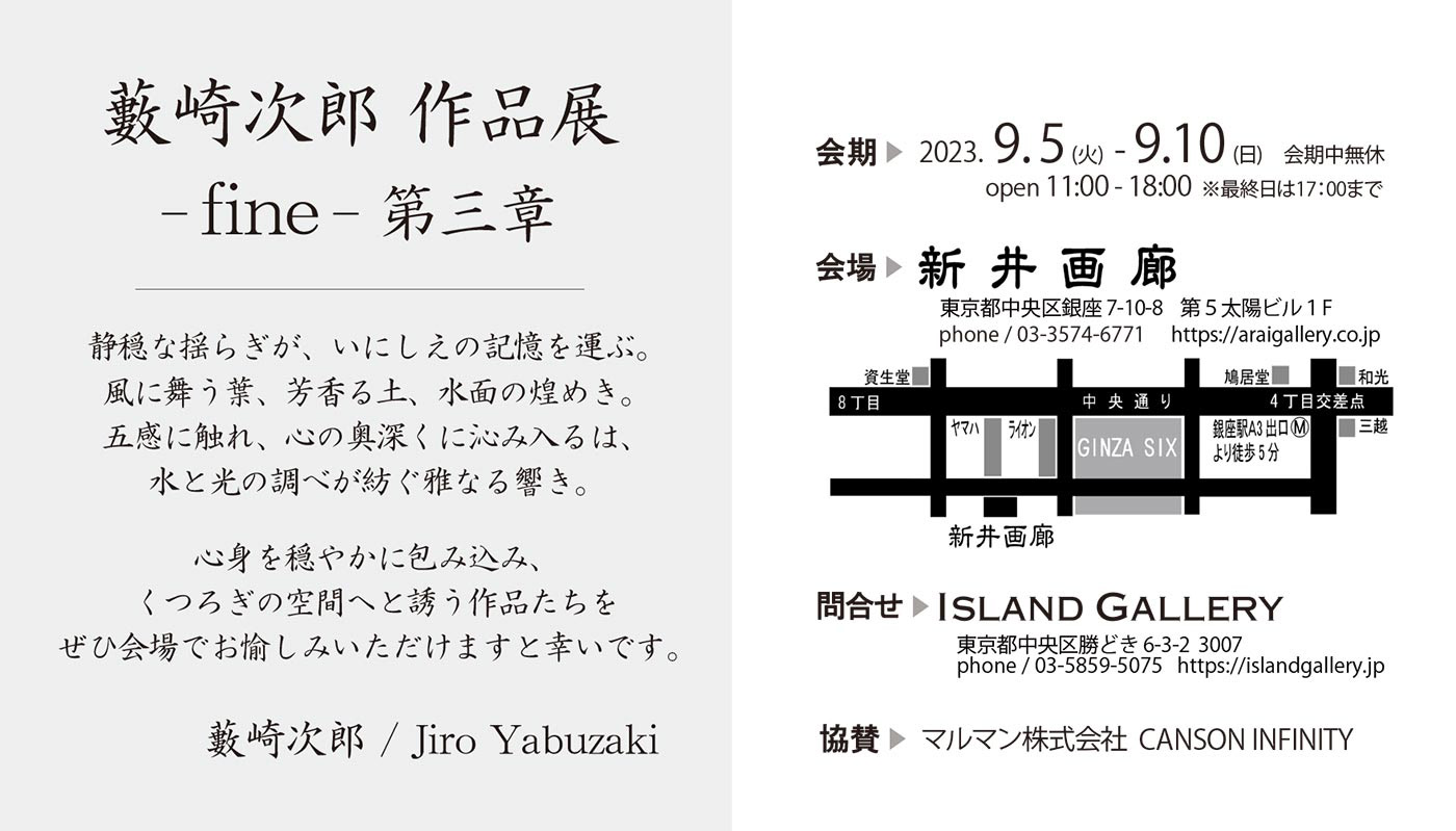 9/5(火)~9/10(日)の会期で、東京銀座・新井画廊にて作品展『-fine-第三章』を開催させていただきます。会期中は全日在廊しますので、お近くをお通りの際はぜひお立ち寄りいただけますと嬉しく存じます。