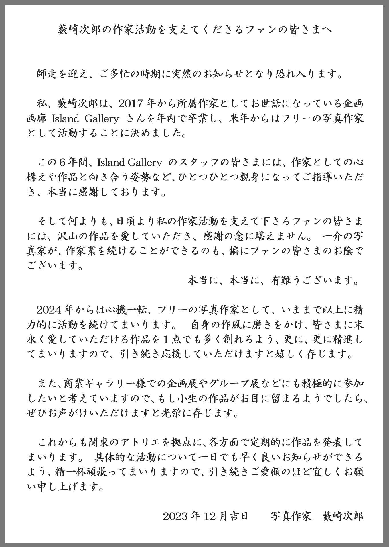 藪崎は今後も活動の幅を広げ、自然との共鳴をテーマとした独自の美術表現を通じて、国内外のファンの皆様に新たな体験を届けてまいります。これからの歩みにどうぞご期待いただくとともに、変わらぬご支援を賜れましたら幸いです。
